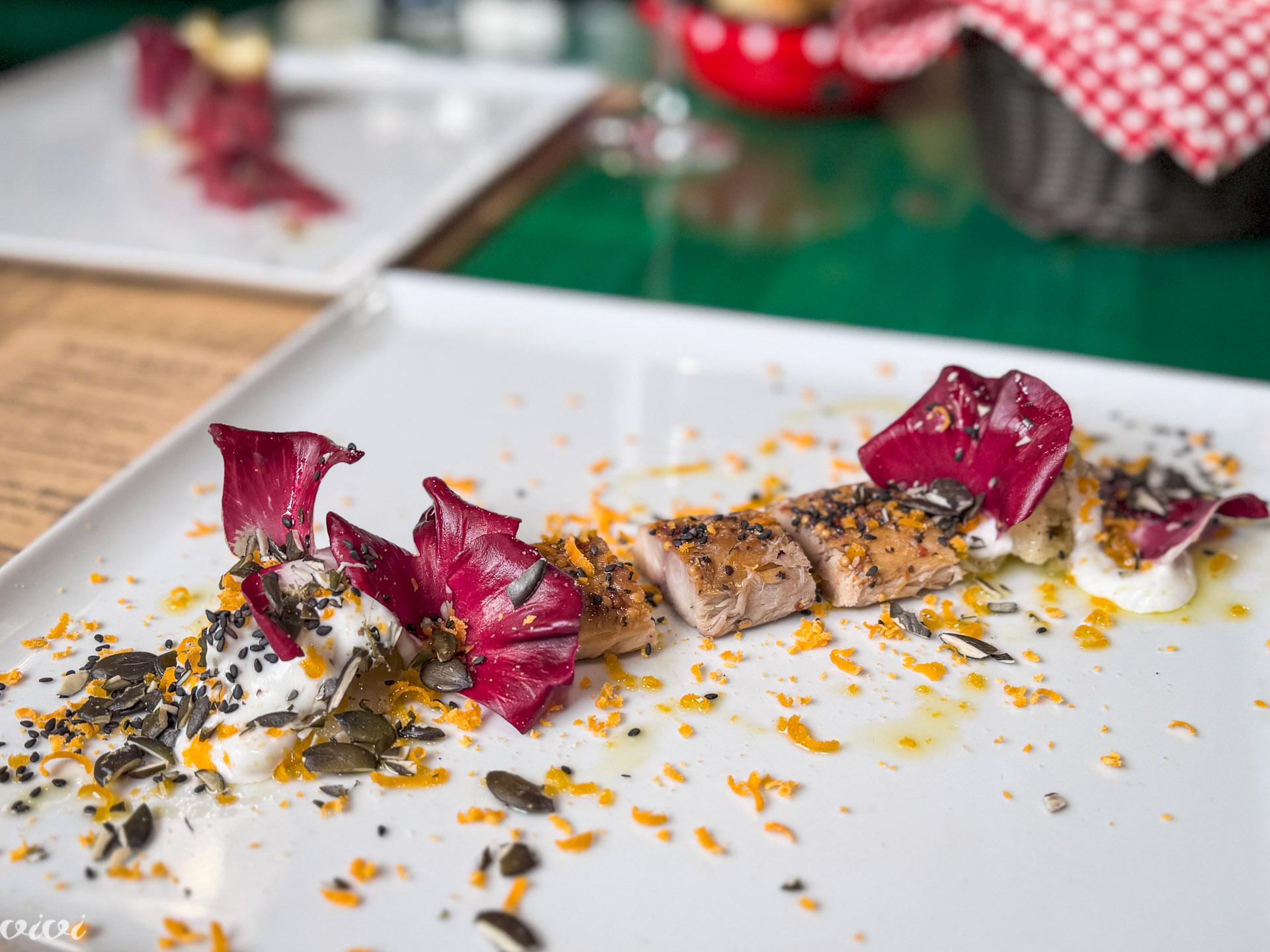 Marinirana skuša z regutom, okisano cvetačo, jogurtom z bučnimi semeni in dehidriran rumenjak. Žogica se s solkanskim radičem ne trudi le že več kot desetletje, temveč še vedno!