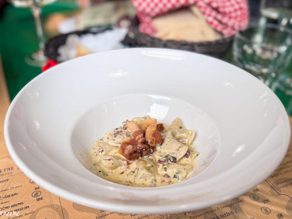 Žlikrofi Žogica (smetana, peteršilj, pršut, česen). Všečna jed, ki za povrh ponudi hrustljavi pršut. Ker je to hišna testenina in celoletna jed, je njena všečnost razumljiva in pričakovana. Tukaj je dovoljena smetana, ki je drugje odveč. Tukaj je tisto jedčevo zadovoljstvo, zaradi katerega bo dal ‘navadnim’ žlikrofom prednost pred posebnimi žepki. Podobne raviole imajo, namreč vsi, ti žlikrofi pa se ravno prav malo razlikujejo tako od italijanskega kot od slovenskega originala, da so ‘original’ iz Žogice. Zaradi takšnih jedi greš v Žogico – kar tako!