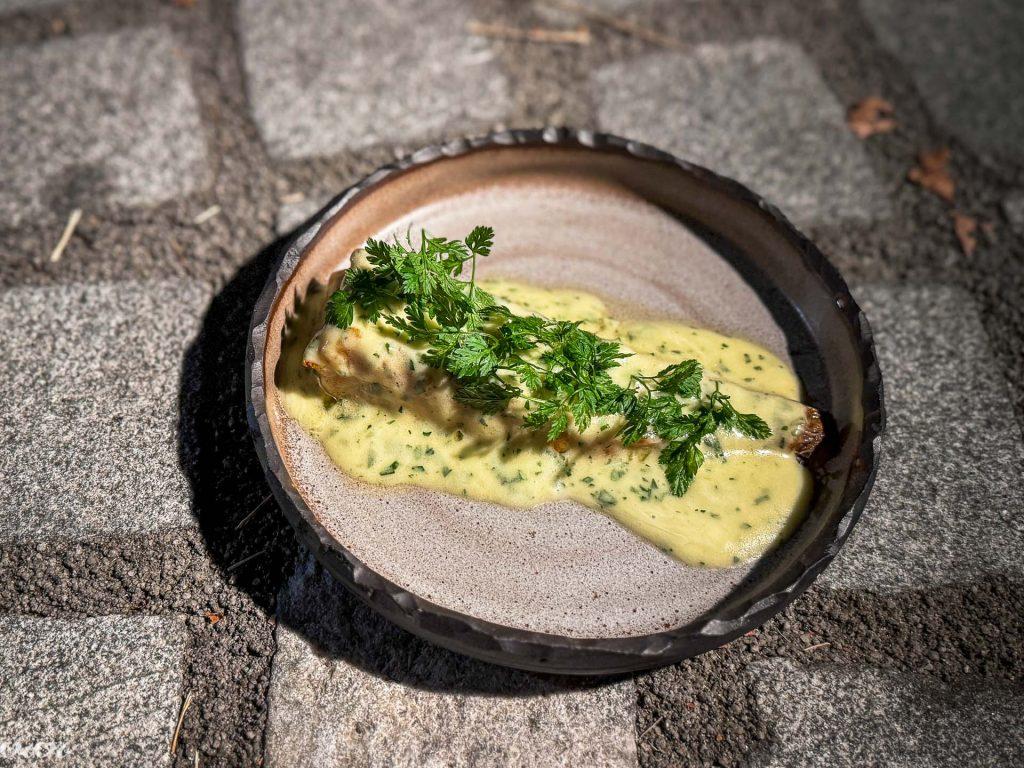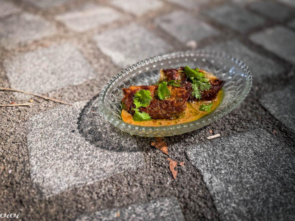 Gyoza, polnjena s petimi vrstami gob, v omaki iz kvasa. Lahko le ponovimo: naročite si ta umami kot samostojno porcijo in le zase, da se ji boste lahko povsem posvetili. To si, namreč, zasluži!