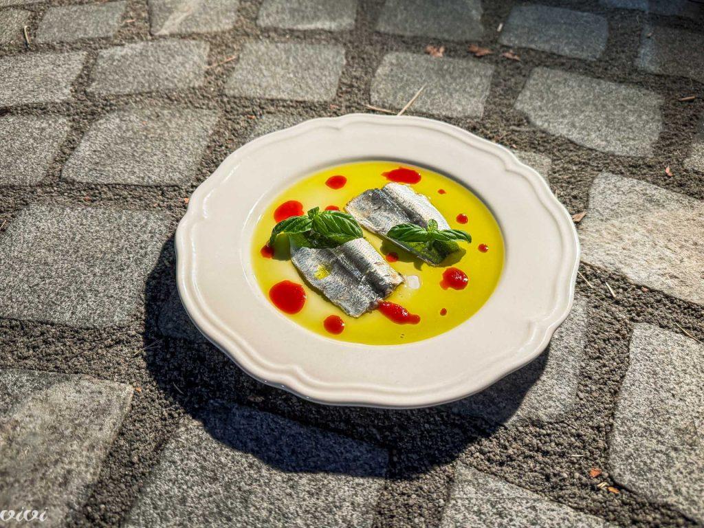 Sardele marinirane v vinskem kisu in oljčnem olju, s paradižnikovo redukcijo. Če bi bile sardele tapas, bi bile ocvrte, če bi bile na morski obali, bi bile v generičnem trisu. Tako pa so na srečo ob Ljubljanici. Preprosto in učinkovito!