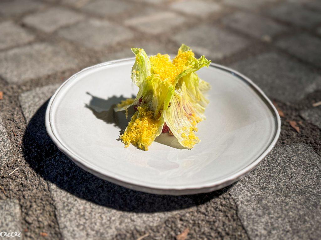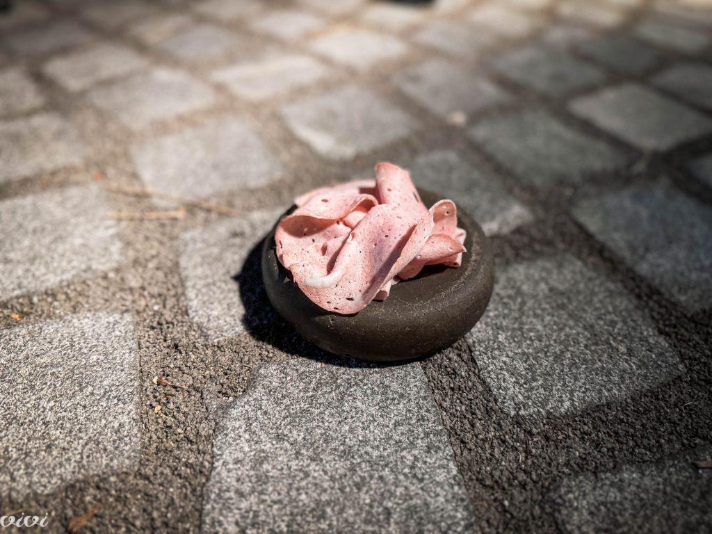 Hišna mortadela, ki jo chef Jakob sam dela. Vajeni trgovinskih in italijanskih, ki nam jih nikoli ne narežejo dovolj in dovolj tanko, dobimo naenkrat mortadelo, ki diši drugače, ni tako velika, je brez pistacij in tudi narezana ni čisto tanko … Ampak, bomo zdaj sploh še jedli tisto prejšnjo?!
