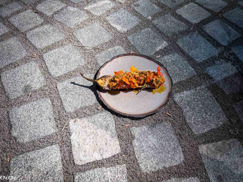 Melancan je (globoko) ocvrt ter prekrit s plastmi hrustljavosti in okusov: parmezan, omaka iz rdeče paprike, ingverja in mete, kapucinke. Še kaj? Najbrž. Jakob Pintar ima občutek za to, da ne vemo povsem natančno, kaj jemo, a nam je ravno zato všeč. Če tapasi vina le spremljajo, jih tabarsi izzivajo.