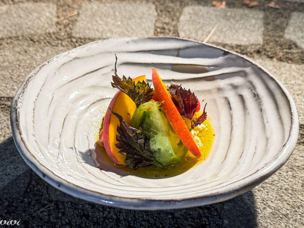 Osvežilna kombinacija barv, oblik, sladkosti in sočnosti paradižnikov z nektarino ter kozjim sirom. Začimbna moč azijske sorodnice mete, perile (šiso).