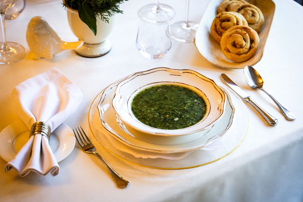 Pogrinjki so skrbni, kruh je odličen, porcelan pa bel. In takšne so tudi Kendove jedi, nobenega leporečja, nobenih nepotrebnih sestavin, tehnik, presenečenj. vse je dobro in vse je brezhibno, čeprav nič ni zapleteno in povzdignjeno. Postrv je le marinirana, toda zato je iz Kanomljice, zelševka je le znotraj mehka in zunaj hrustljava, toda zato je kot potica, juha je le sezonska, toda zato je iskrena, ravioli so z gobami, toda zato so žlikrofi z bakalco, jagnje je z ješprenjem, toda srna je z marmelado iz suhih hrušk in merlota. Vsak večer je le en meni, toda v takšnem okolju in razkošju je vse, kar je na krožnikih manj, pravzaprav več.